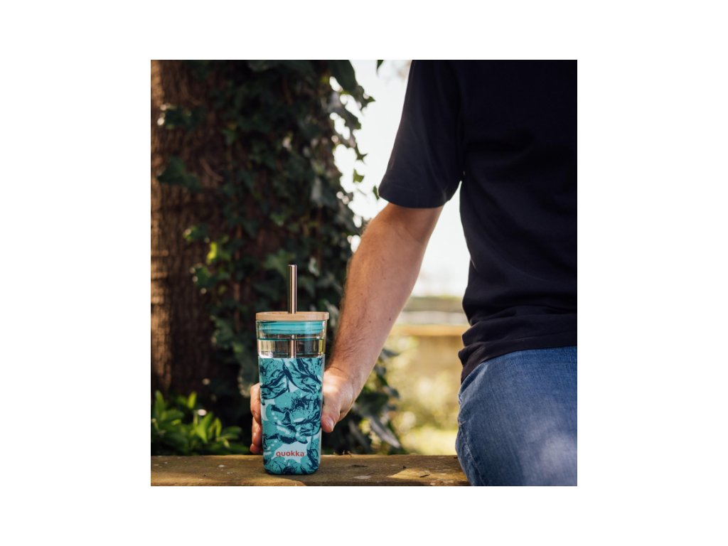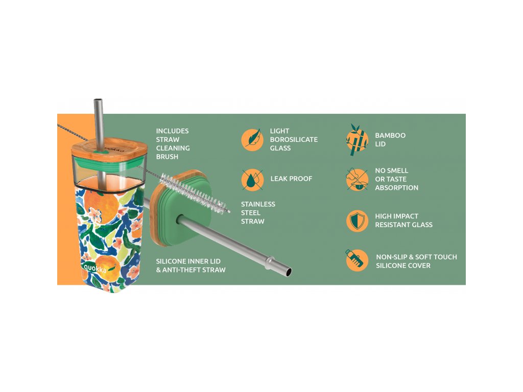 Sklenený cestovný hrnček Quokka Liquid Cube s kovovou slamkou je vybavený spoľahlivým tesniacim viečkom z bambusu a silikónu. Protišmykový silikónový návlek uľahčuje a spríjemňuje držanie hrnčeka.