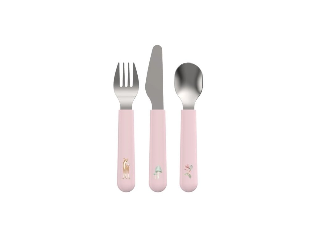 3-dielna sada príboru z kvalitnej nerezovej ocele s plastovou rukoväťou pre ľahké držanie s krásnou potlačou. Nôž má bezpečný zúbkovaný okraj.