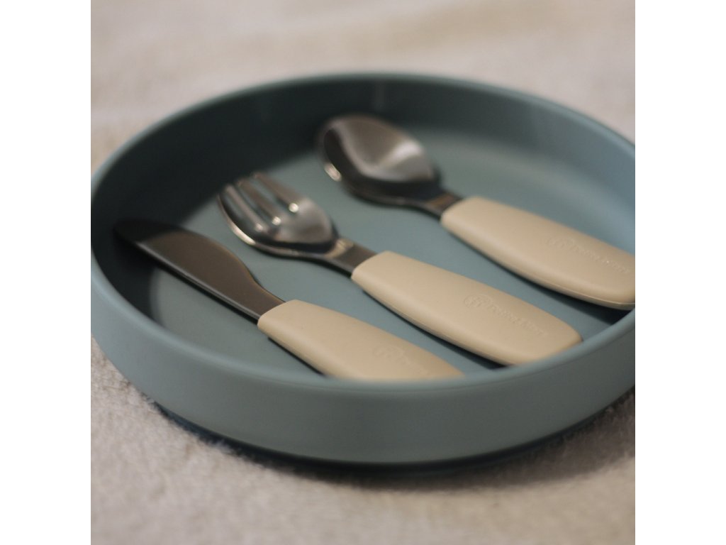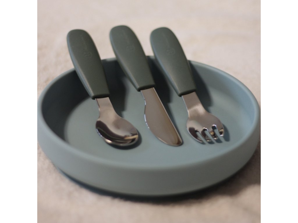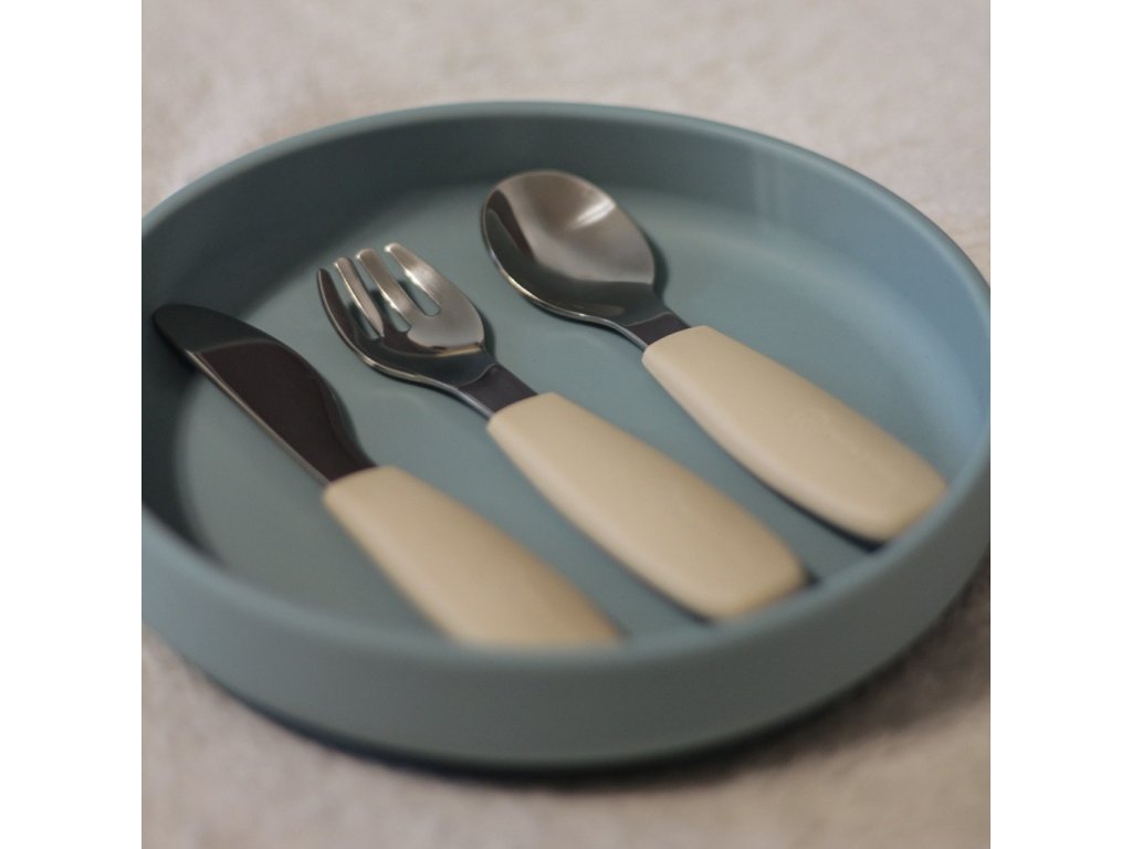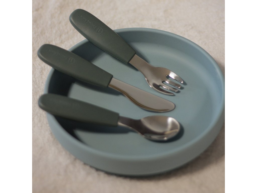 Funkčné časti sú vyrobené z kvalitnej nehrdzavejúcej ocele, rukoväte sú ergonomické a potiahnuté mäkkým silikónom vhodným na kontakt s potravinami – ideálne prispôsobené detským rúčkam. To zaručuje pohodlný a istý úchop a podporuje správne stravovacie návyky.