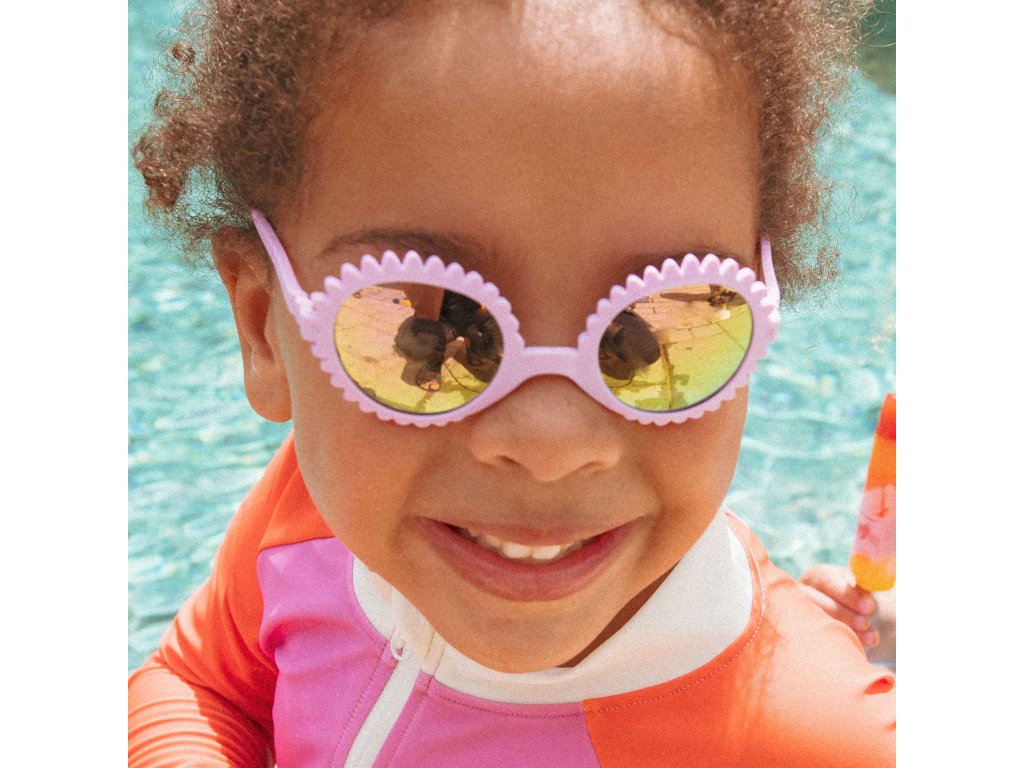 Extra ochrana 100% UVA, UVB a UVC filter (UV400), kategória 3. Odolné zrkadlové polykarbonátové sklá s najkvalitnejším filtrom. Blue Blocker – filter škodlivého modrého svetla, zníženie oslnenia a zabezpečenie vizuálneho komfortu. Dostatočná veľkosť skiel, aby zatienili celé okolie očí. Certifikované podľa európskych noriem EN ISO 12312-1:2013/A1:2015. Extra bezpečnosť Nerozbitný ohybný rám – deti bočnice nezlomia ani nevykrútia. Bez nebezpečných pántov a skrutiek. Extra pohodlie Ultra ľahký a flexibilný rám v tvare kvetinky. Bočnice tenké a ohnuté, aby netlačili za uškami. Odnímateľná gumička udrží okuliare správne nasadené.