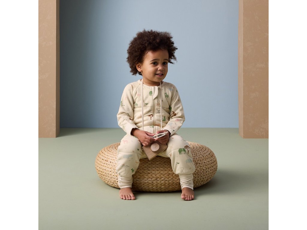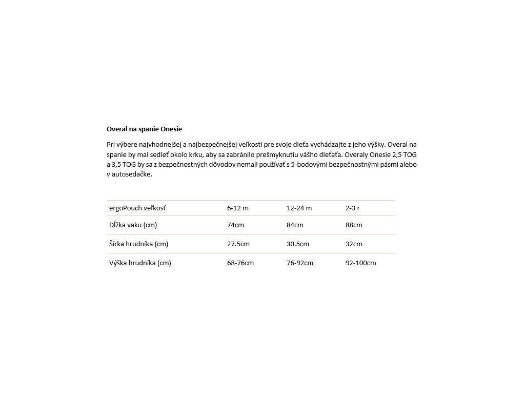 Overal Onesie je alternatívou spacieho vaku s označením TOG, ktorá je určená na nosenie samostatne počas spánku. Sú ideálnou voľbou pre batoľatá, ktoré prechádzajú do veľkej postele, spáčov, deti, ktoré odkopávajú prikrývky alebo malé hviezdičky, ktorým sa nepáči obmedzenie spacieho vaku. Spací vak je vyrobený z organickej bavlny s certifikátom GOTS, ktorá je netoxická a šetrná k podráždenej pokožke a je ňou aj vyplnený. Strečový materiál umožňuje vášmu dieťatku voľný pohyb a pohodlie pri spánku. Trojcestný potvrdzovací zips je užitočný pri nočných výmenách plienok alebo cestách na toaletu a manžety na nohy dodávajú extra teplo malým prstom.