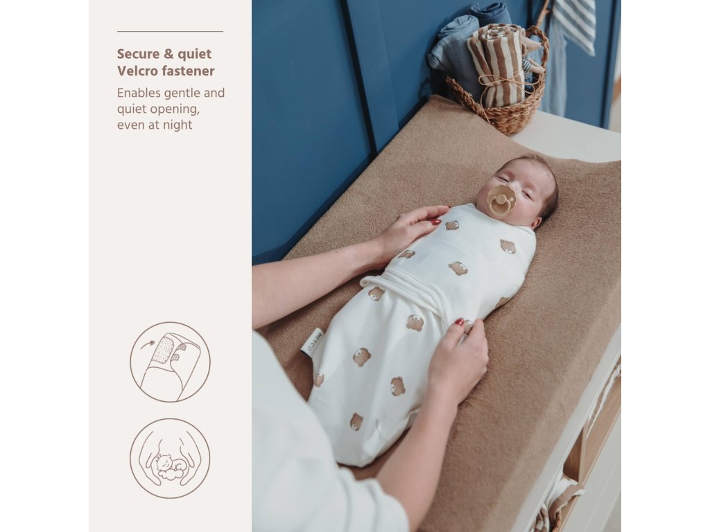 Vhodná od narození do 3 měsíců (hmotnost cca 3,5 - 6,5 kg, délka cca 50 - 62 cm)Materiál: 100% bavlna Jak zavinout své dítě pomocí Zavinovačky Meyco Umístěte své dítě tak, aby ramena byla v úrovni horní části zavinovačky. Umístěte nohy do nánožníku. Přeložte levou chlopeň spojenou kolem těla a paží vašeho dítěte. Upevněte oba díly na suchý zip k sobě. Přeložte pravou chlopeň přes levou chlopeň a připevněte dva suché zipy k části se suchým zipem levé chlopně.