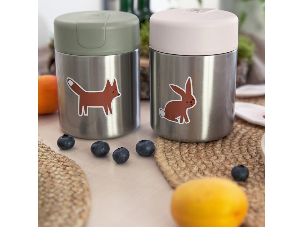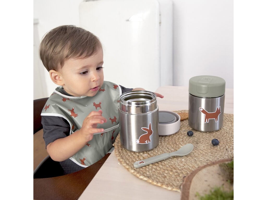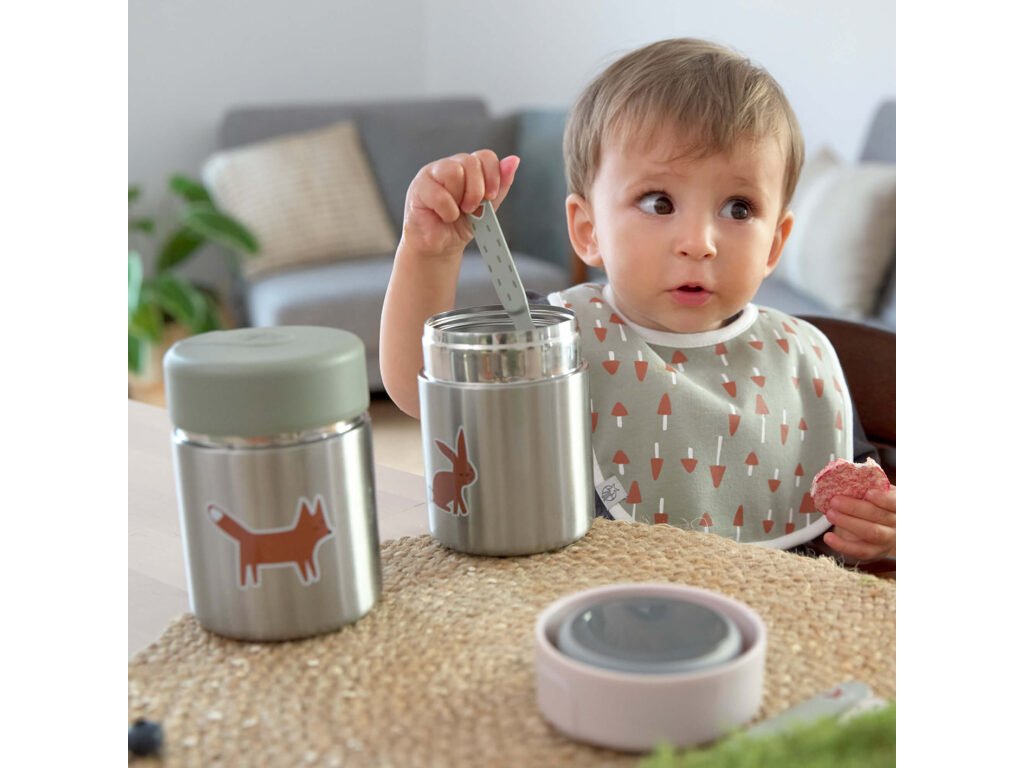 Nemecká značka LÄSSIG je lídrom v predaji doplnkov pre maminky a deti v západnej Európe. Ich výrobky sa vyznačujú veľmi vysokou úrovňou spracovania a tiež praktickosťou, vďaka ktorej si výrobky tejto značky obľúbili zákazníci vo viac než päťdesiatich krajinách sveta. Samostatnou kapitolou sú potom materiály, ktoré sa vyznačujú nie len špičkovou kvalitou a odolnosťou, ale tiež ekologickosťou a napomáhajú k dosiahnutiu nadčasového dizajnu. Spoločnosť Lässig GmbH je častým zberateľom významných ocenení. Výsledky svojho úspešného pôsobenia si však spoločnosť nenecháva len pre seba a podporuje celú radu charitatívnych a ekologických projektov. Termoska na jedlo udrží desiatu teplú alebo studenú v závislosti na požiadavku. Je vyrobená z vysoko kvalitnej nerezovej oceli, je nepriepustná. Vďaka svojmu dizajnu sa hodí nie len na piknik do prírody ale i do víru veľkomesta. Termosku možno jednoducho umyť. Termoska nesmie byť používaná na karbonizované nápoje. Nehodí sa tiež na uchovanie mliečnych výrobkov. •vyrobená z kvalitnej nerezovej oceli •moderný dizajn •udržanie teploty pokrmu až niekoľko hodín •výrobok nie je určený do mikrovlnnej rúry •možnosť umývania v umývačke riadu •zloženie jednotlivých častí neobsahuje BPA, PVC a ftaláty •termoska je určená pre deti od 1 roku objem nádoby je 315 ml rozmery: 8,8 x 8,8 x 12,5 cm váha: 255 g Pre zlepšenie izolačného účinku naplňte pred použitím termosku studenou/horúcou vodou na cca 4 minúty. K tomuto účelu nikdy nepoužívajte rúru alebo mrazničku. Pri použití dôkladne utiahnite uzáver. Vždy po použití termosku prepláchnite horúcou vodou a vysušte. Na čistenie nepoužívajte rozpúšťadlá, abrazívne alebo bieliace prostriedky.