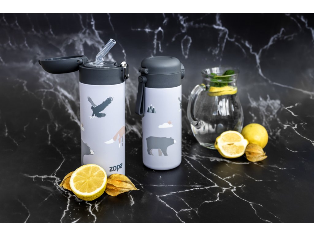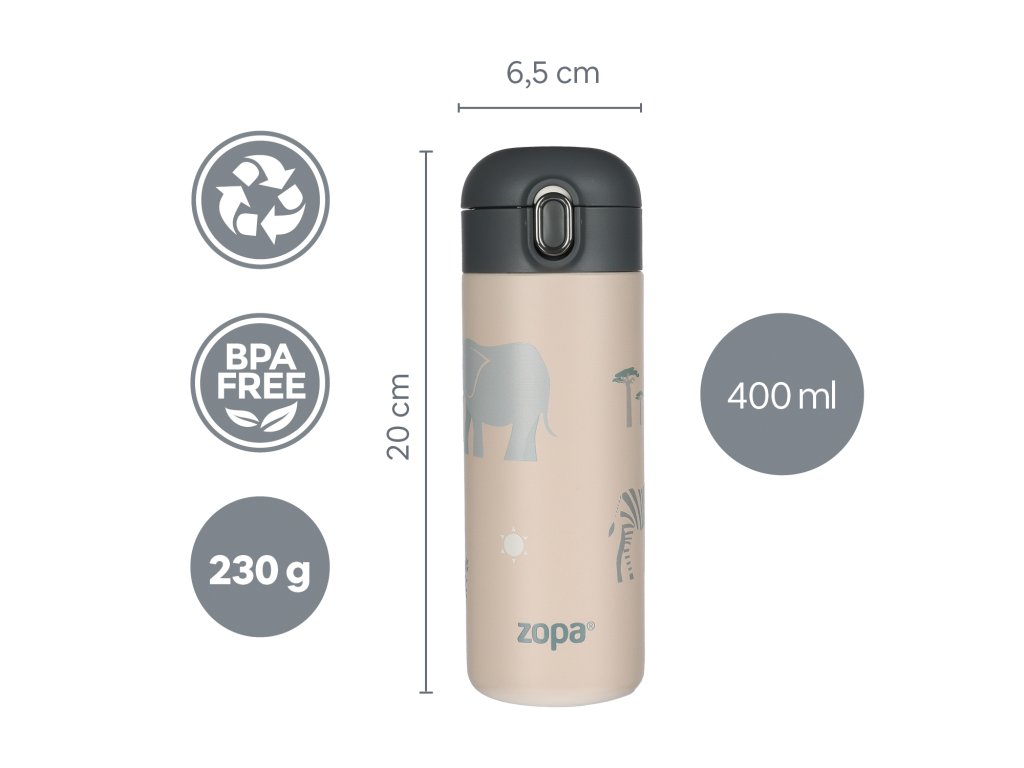 Osviežujúca šťava alebo teplý čaj? Dizajnová termoska 400 ml s veselými motívmi a vzduchotesným uzáverom udrží nápoje horúce 12 h, chladné 24 h. Ideálne na dobrodružstvo.