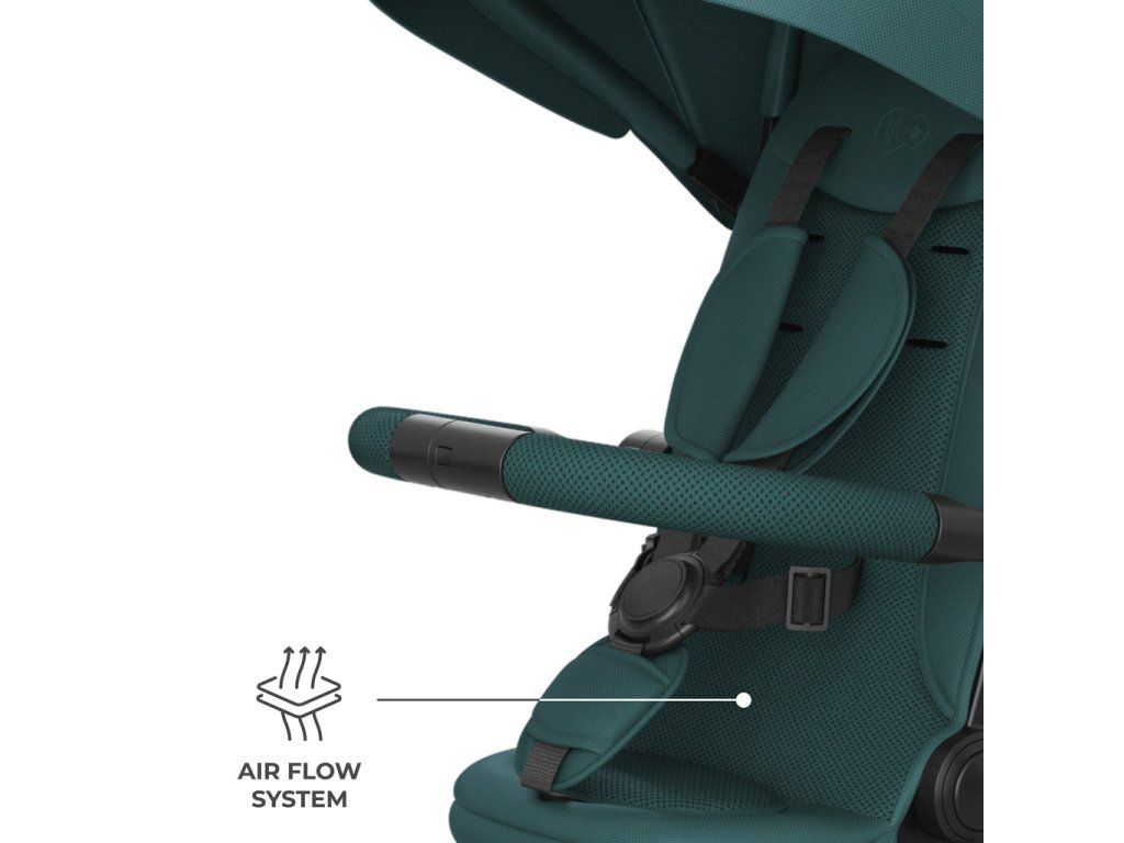 Na dlhších trasách výrazne pomáha pololežiaca poloha, dostupná ako po smere jazdy, tak proti smeru jazdy. Keď dieťa únavou zavrie oči, rodič rýchlo sklopí opierku a pokračuje v prechádzke bez narušenia denného rytmu. Pri jazde proti smeru jazdy môže dieťa odpočívať a vidieť na starajúcu osobu, čo často uľahčuje upokojenie a zaisťuje maximálny pocit bezpečia. Pohodlie dopĺňajú ventilované vložky AIR FLOW a nastaviteľná strieška s okienkom - ľahko ju prispôsobíte počasiu a počas jazdy na dieťa vidíte.