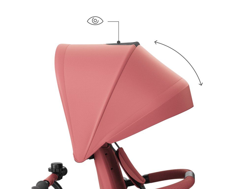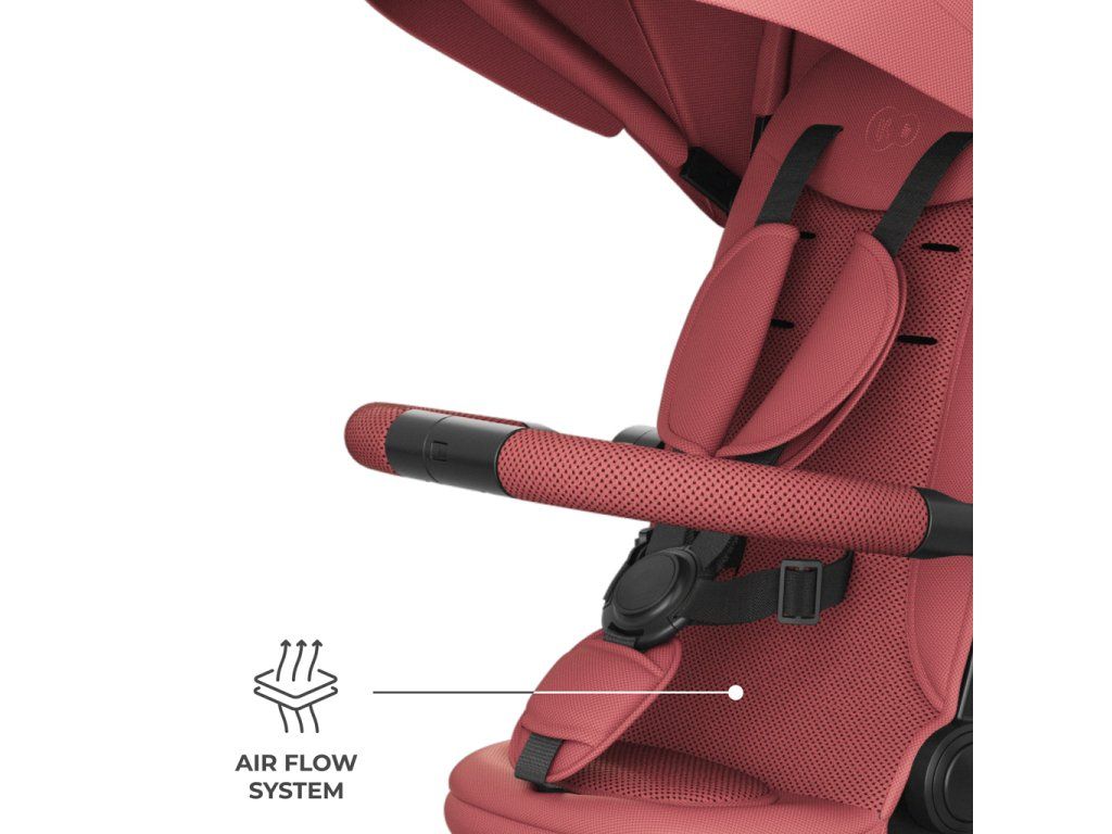 Na dlhších trasách výrazne pomáha pololežiaca poloha, dostupná ako po smere jazdy, tak proti smeru jazdy. Keď dieťa únavou zavrie oči, rodič rýchlo sklopí opierku a pokračuje v prechádzke bez narušenia denného rytmu. Pri jazde proti smeru jazdy môže dieťa odpočívať a vidieť na starajúcu osobu, čo často uľahčuje upokojenie a zaisťuje maximálny pocit bezpečia. Pohodlie dopĺňajú ventilované vložky AIR FLOW a nastaviteľná strieška s okienkom - ľahko ju prispôsobíte počasiu a počas jazdy na dieťa vidíte.