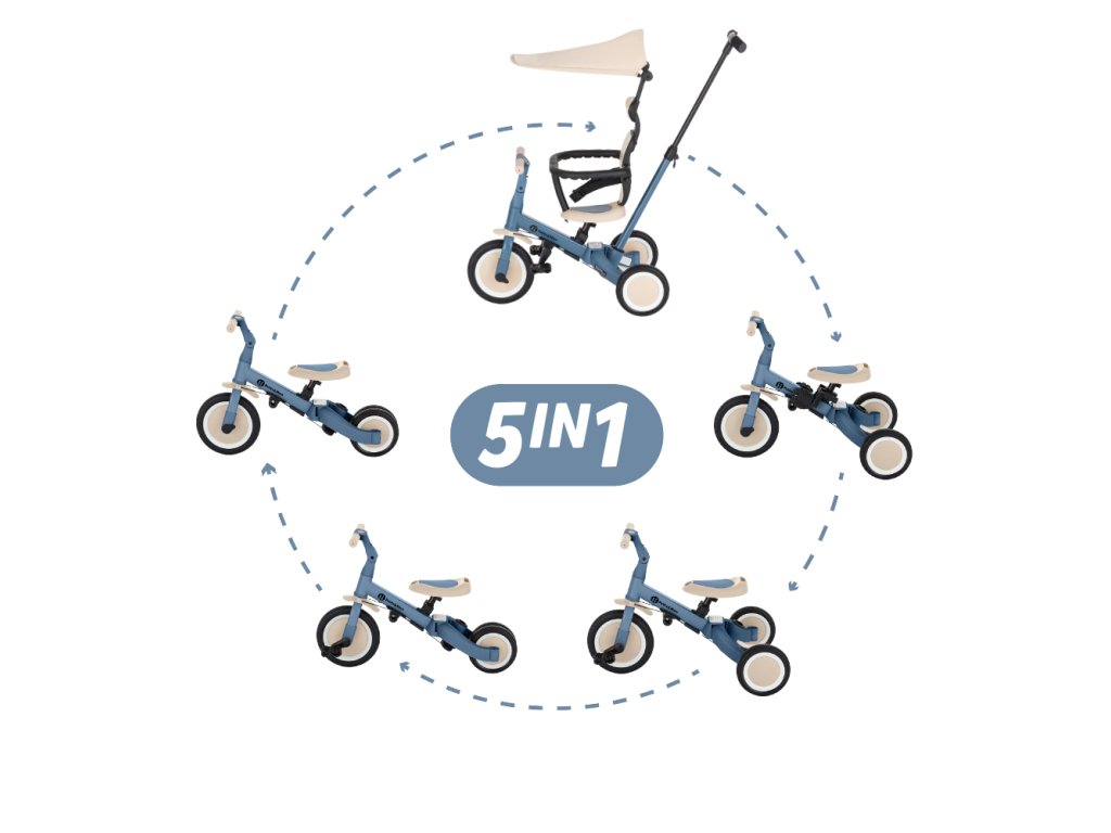 Multifunkčná trojkolka určená pre deti od 1,5 do 5 rokov alebo do 25 kilogramov. Je to nielen dopravný prostriedok na presun a učenie sa rovnováhy, ale aj spoločník pre rastúce dieťa počas mnohých vývojových fáz. Premyslená transformácia bicykla sa prispôsobuje potrebám dieřatka podľa toho, ako sa vyvíjajú jeho motorické schopnosti. Spočiatku je to trojkolka s možnosťou asistencie rodiča, zatiaľ čo konečná verzia je štandardný bicykel s pedálmi, bez akýchkoľvek ďalších podporných prvkov. Vďaka takýmto zmenám môžete pomôcť svojmu dieťaťu naučiť sa jazdiť na dvoch kolesách.