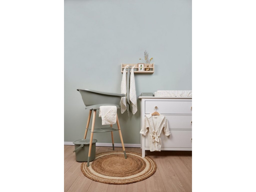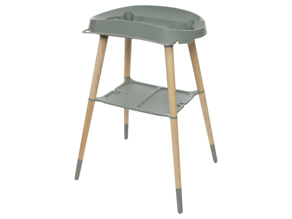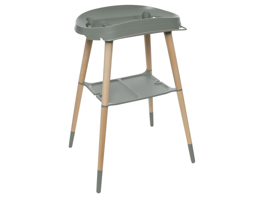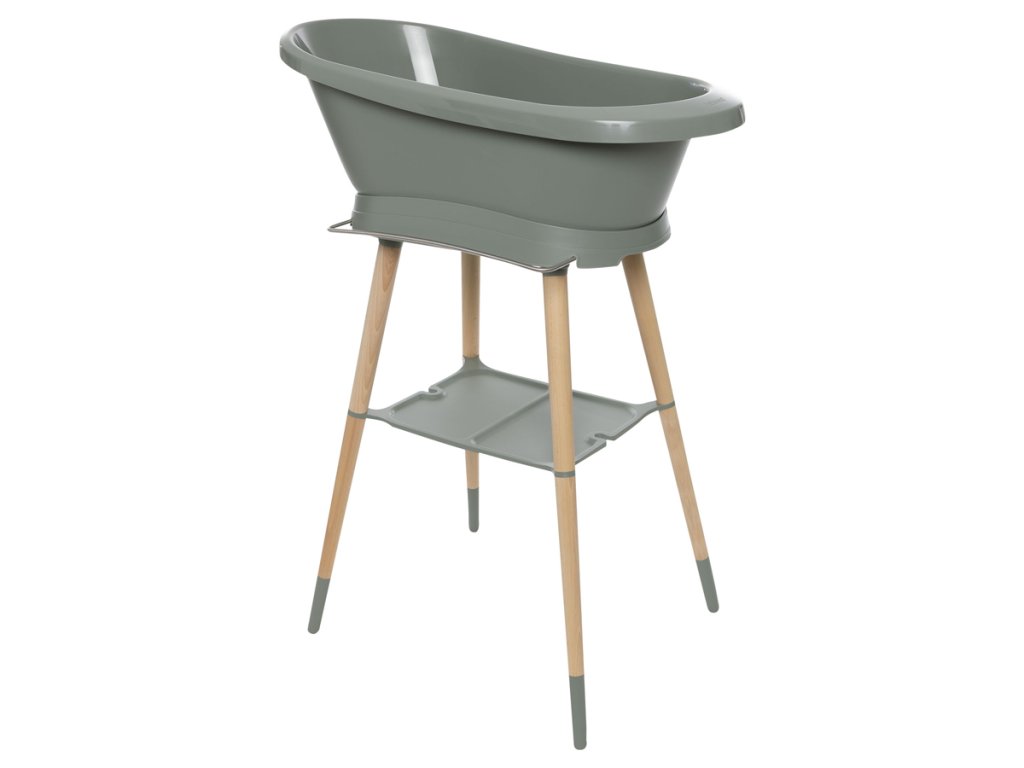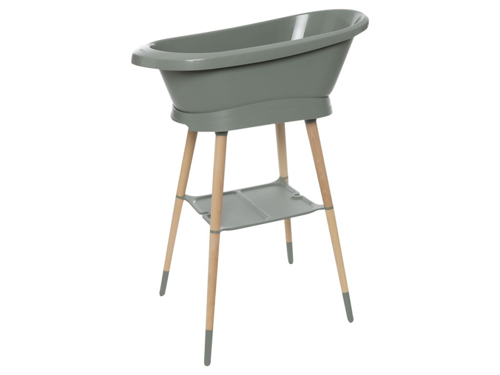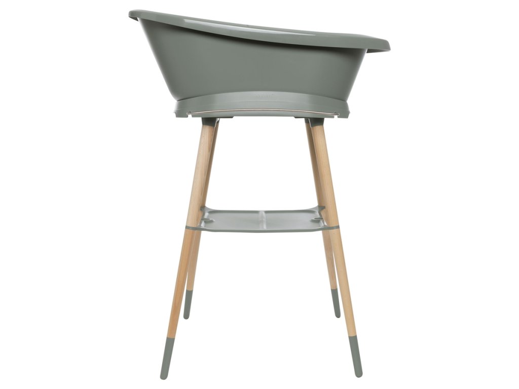 Veľmi stabilný vaňový stojan Sense má nohy vyrobené z lakovaného bukového dreva s certifikáciou FSC. To dodáva stojanu teplý moderný vzhľad. Je vybavený praktickými pomôckami; vpredu je pripevnený držiak na uteráky. Priestranná plastová polička poskytuje dostatok miesta napríklad na šampón, žinku, vodné hračky alebo kúpací gél. To znamená, že máte po ruke všetky potrebné veci, aby ste si s malým mohli v pokoji kúpanie užiť. Inovatívny systém upevnenia zaisťuje, že vaňu možno ľahko pripevniť k stojanu a rovnako ľahko sňať. Po kliknutí môžete svoje bábätko nerušene a bezpečne kúpať.